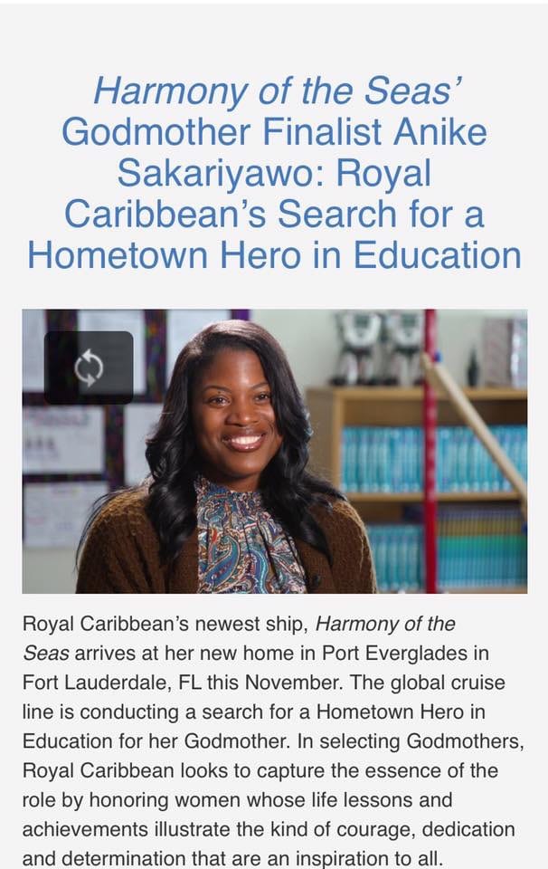 Royal Caribbean’s newest ship, Harmony of the Seas arrives at her new home in Port Everglades in Fort Lauderdale, FL this November. The global cruise line is conducting a search for a Hometown Hero in Education for her Godmother. In selecting Godmothers, Royal Caribbean looks to capture the essence of the role by honoring women whose life lessons and achievements illustrate the kind of courage, dedication and determination that are an inspiration to all.